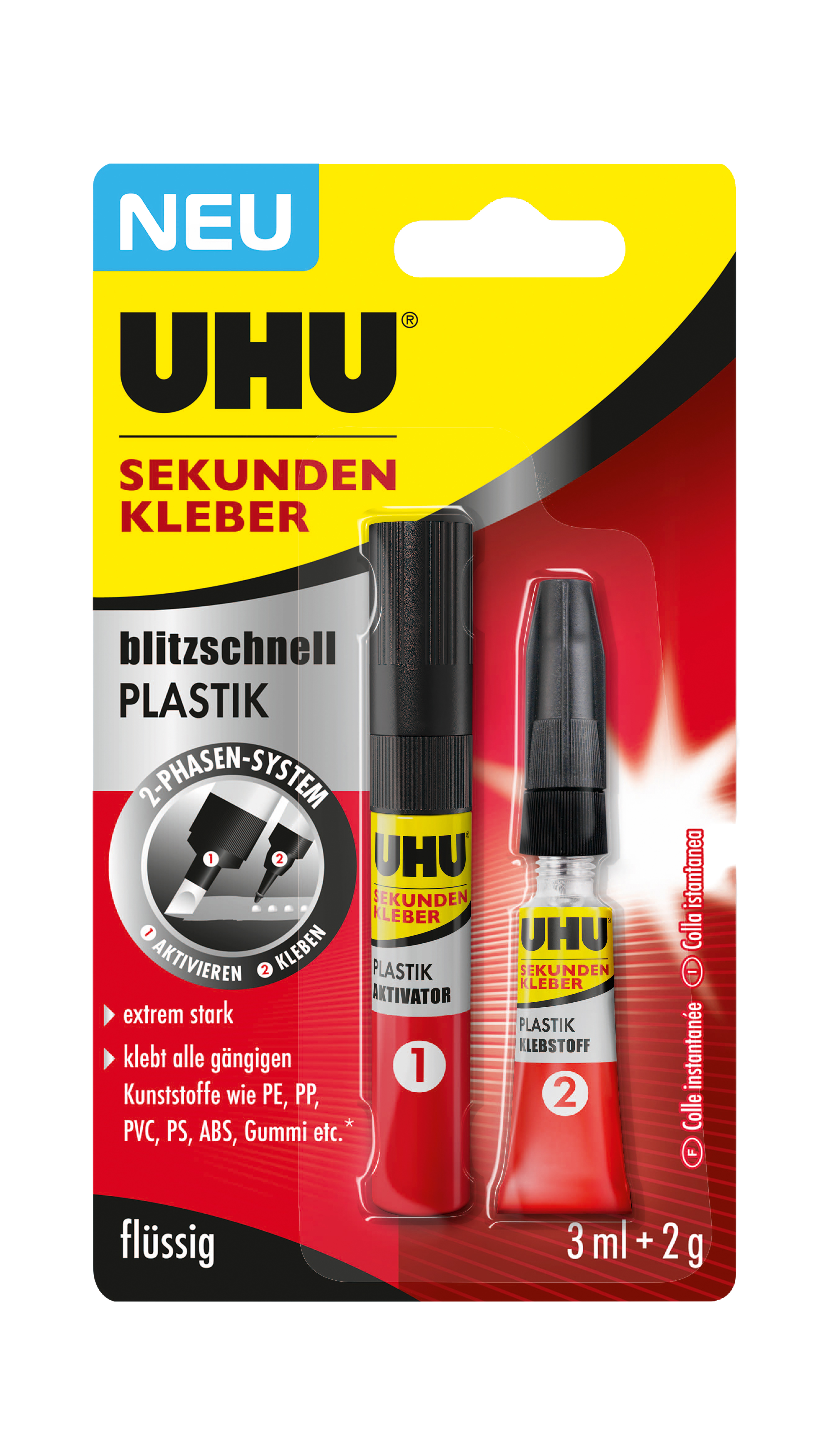 - UHU Sekundenkleber Plastik ist ein blitzschneller 2-Phasen-Sekundenkleber